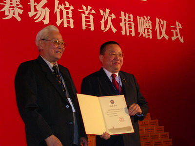 校長助理海聞主持儀式 10月15日下午,“北京大學(xué)2008年奧運(yùn)會(huì)乒乓球比賽場館首次捐贈(zèng)儀式”在北京大學(xué)英杰交流中心隆重舉行。中國乒乓球隊(duì)總教練、國家體育總局乒羽中心乒乓球部主任蔡振華,中國乒乓球隊(duì)總領(lǐng)隊(duì)黃彪,2004年男子乒乓球雙打冠軍陳玘,2004年雅典奧運(yùn)會(huì)乒乓球男子單打亞軍王皓,北京2008年奧申委形象大使、北京大學(xué)新聞傳播學(xué)院學(xué)生桑蘭,2000年悉尼奧運(yùn)會(huì)女子平衡木世界冠軍、北京大學(xué)新聞傳播學(xué)院學(xué)生劉璇,曾7次奪得乒乓球比賽世界冠軍、現(xiàn)北大方正乒乓球俱樂部總經(jīng)理劉偉,捐資企業(yè)代表,北京大學(xué)前校長、教育基金會(huì)理事長吳樹青教授等校內(nèi)外嘉賓和北大師生代表100多人出席了儀式。儀式的舉辦,標(biāo)志著為北京大學(xué)2008年奧運(yùn)會(huì)乒乓球比賽場館籌集資金的“萬企工程”正式啟動(dòng)。