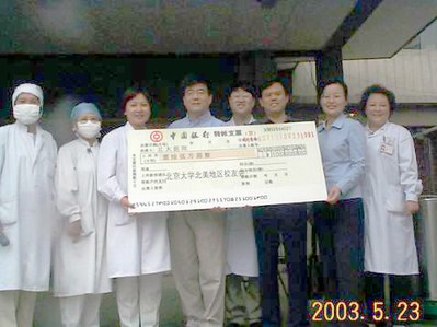 5月23日上午,我校校長(zhǎng)助理海聞教授帶領(lǐng)教育基金會(huì)副秘書長(zhǎng)鄧婭、嚴(yán)軍前往北大醫(yī)院,代表北京大學(xué)北美地區(qū)13個(gè)校友會(huì)向北大醫(yī)院送去捐贈(zèng)款18萬(wàn)元人民幣,以表示我校北美地區(qū)全體校友對(duì)奮戰(zhàn)在抗擊非典第一線的北大醫(yī)院全體醫(yī)護(hù)人員的慰問(wèn)和關(guān)愛。北大醫(yī)院常務(wù)副院長(zhǎng)夏鐵安先生代表醫(yī)院全體醫(yī)護(hù)人員接受了捐款。