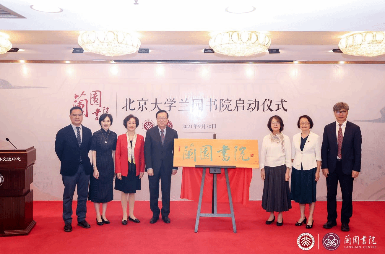 郝平、王博、柯楊、袁明、吳虹、外國(guó)語(yǔ)學(xué)院法語(yǔ)系主任董強(qiáng)教授、蘭園書(shū)院執(zhí)行院長(zhǎng)鄭如青為蘭園書(shū)院揭牌。