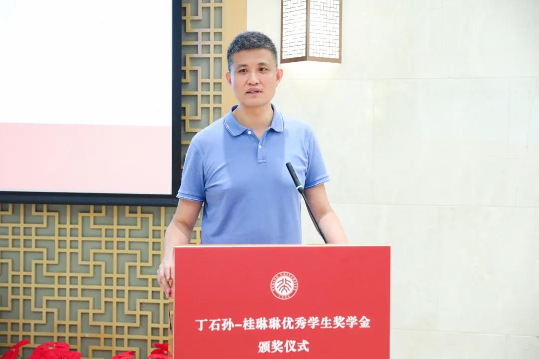丁干回憶了父母當(dāng)年設(shè)立獎(jiǎng)學(xué)金的想法和囑托。他表示,父母作為幾十年的基礎(chǔ)課教師,特別重視基礎(chǔ)課。“自己從小就在北大校園里成長(zhǎng),無(wú)論北大如何變化,無(wú)論前沿研究如何進(jìn)展,但基礎(chǔ)學(xué)科發(fā)展的基礎(chǔ)不會(huì)變”,這是他和哥哥設(shè)立此項(xiàng)獎(jiǎng)學(xué)金的初衷。他向獲獎(jiǎng)學(xué)生表示衷心祝賀,肯定他們?cè)诨A(chǔ)課上所取得的優(yōu)秀成績(jī),希望這份“不多”的獎(jiǎng)勵(lì)能夠成為大家成長(zhǎng)之路上的里程碑,并為此再接再厲,繼續(xù)前進(jìn)。他也感謝大家為這項(xiàng)獎(jiǎng)學(xué)金的管理和實(shí)施所付出的努力,期待此項(xiàng)獎(jiǎng)學(xué)金能夠一直延續(xù)下去。