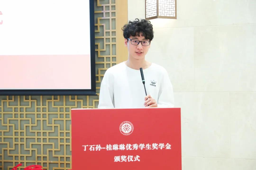 獲獎(jiǎng)學(xué)生代表、化學(xué)與分子工程學(xué)院2018級(jí)本科生徐哲分享了自己學(xué)習(xí),參與科研工作的感想和對(duì)未來(lái)學(xué)習(xí)的設(shè)想。“志不求易者成,事不避難者進(jìn)”,他堅(jiān)信,要夯實(shí)基礎(chǔ)課程內(nèi)容和豐富專業(yè)課程知識(shí),保持自己的求真、求知心,才能成為對(duì)社會(huì)有價(jià)值的科研工作者。他表示,獎(jiǎng)學(xué)金和這份榮譽(yù)是肯定也是鼓舞,未來(lái)一定不會(huì)辜負(fù)丁先生伉儷的殷切期待,在科研工作和生活中不驕不躁,和大家一同努力,一起進(jìn)步。