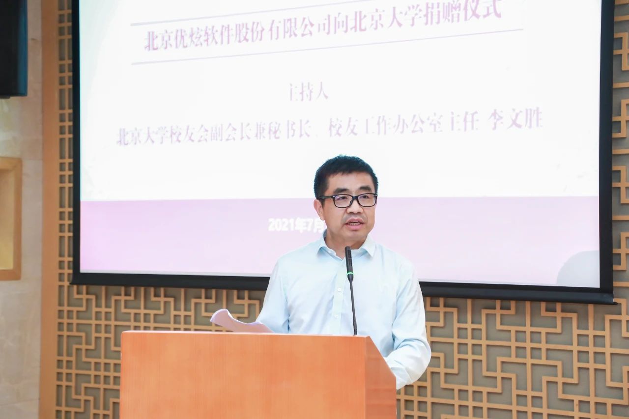 北京優(yōu)炫軟件股份有限公司董事長梁繼良校友攜家人及公司高管,王濤、耿德紅、鄒銳等嘉賓,北京大學(xué)副校長、教育基金會副理事長王博,體育教研部主任錢俊偉,校友工作辦公室副主任張向英,教育基金會秘書長李宇寧、副秘書長耿姝等共同出席。北京大學(xué)校友工作辦公室主任李文勝主持儀式。