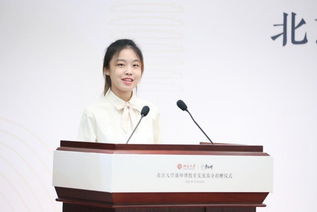 學生代表、元培學院2019級本科生吳玥講述了自己學習成長的歷程和走進康師傅控股的實踐體會。她感受到康師傅控股對青年的關心,為社會謀福祉、服務人民美好生活的品牌愿景。她也將以己之力“呼吁、號召、引導更多的北大新青年們投身推動民族復興和人民幸福的宏偉道路”。