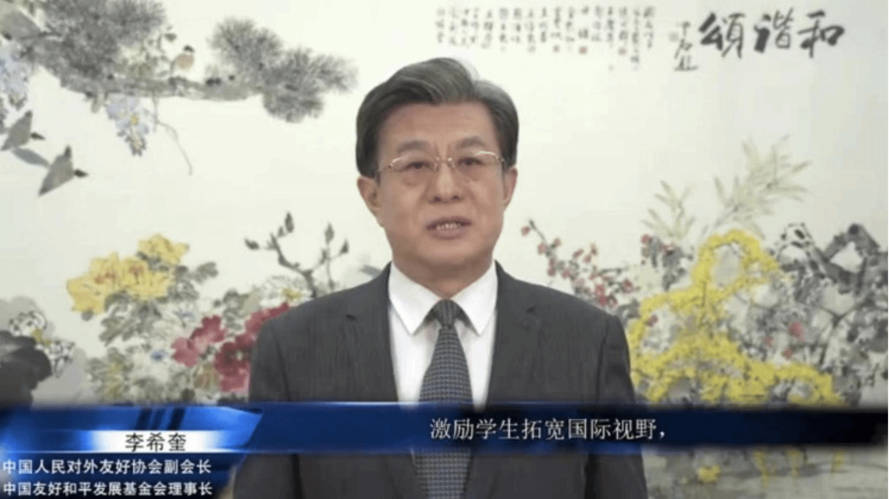 中國(guó)人民對(duì)外友好協(xié)會(huì)副會(huì)長(zhǎng)、中國(guó)友好和平發(fā)展基金會(huì)理事長(zhǎng)李希奎發(fā)表視頻致辭。他寄語獲獎(jiǎng)學(xué)生:你們是國(guó)家的未來,民族的希望,在向第二個(gè)百年奮斗目標(biāo)進(jìn)軍的新征程上,希望大家奮發(fā)向上,與時(shí)代同步,與國(guó)家相向,與盛世同行,以青春之我奉獻(xiàn)偉大時(shí)代。