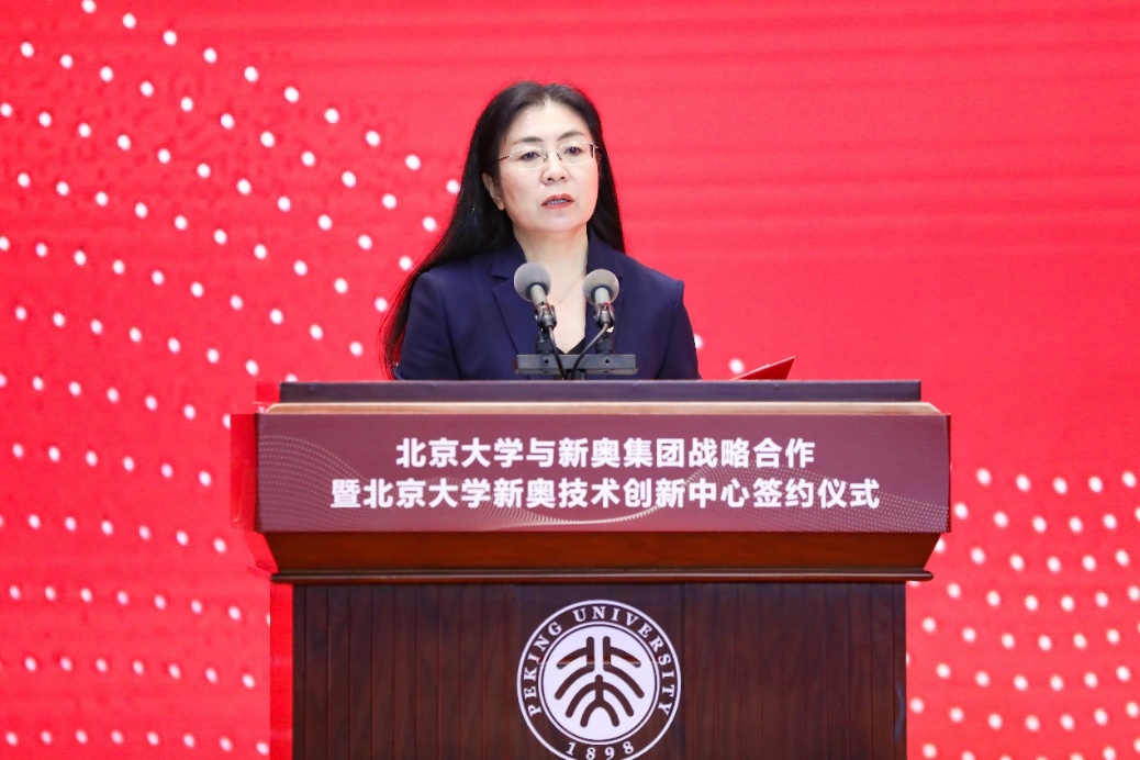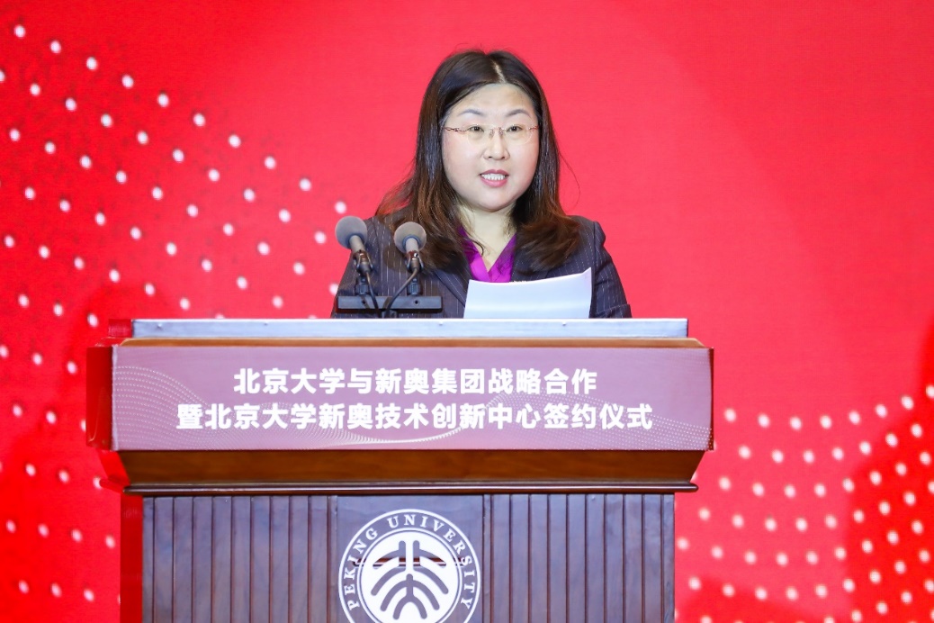 北京大學(xué)與新奧集團(tuán)戰(zhàn)略合作協(xié)議簽約儀式在英杰交流中心陽光廳舉行,寧琦主持儀式。張錦、王玉鎖、段慧玲分別致辭。