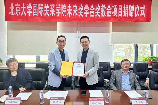 2023年4月29日上午,未來獎學(xué)金獎教金捐贈儀式于北京大學(xué)國際關(guān)系學(xué)院B117會議室舉行。院友代表蔚來汽車聯(lián)合創(chuàng)始人秦力洪、新開發(fā)銀行副行長兼首席執(zhí)行官周強(qiáng)武、北京大學(xué)教育基金會副秘書長王勇出席捐贈儀式,學(xué)院院長唐士其,黨委書記初曉波,副院長張海濱,黨委副書記祝詣博、項佐濤,院長助理、院友辦主任張昕揚,院友辦副主任金瑞等參會。捐贈儀式由項佐濤主持。