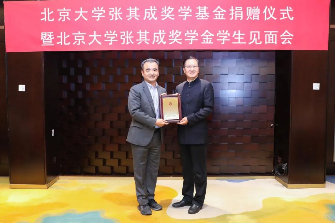 在全場(chǎng)熱烈的掌聲中,張其成向李宇寧遞贈(zèng)捐贈(zèng)支票牌,并向獲獎(jiǎng)學(xué)生代表贈(zèng)書。李宇寧向張其成頒發(fā)北京大學(xué)教育貢獻(xiàn)獎(jiǎng)。