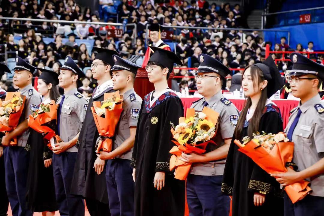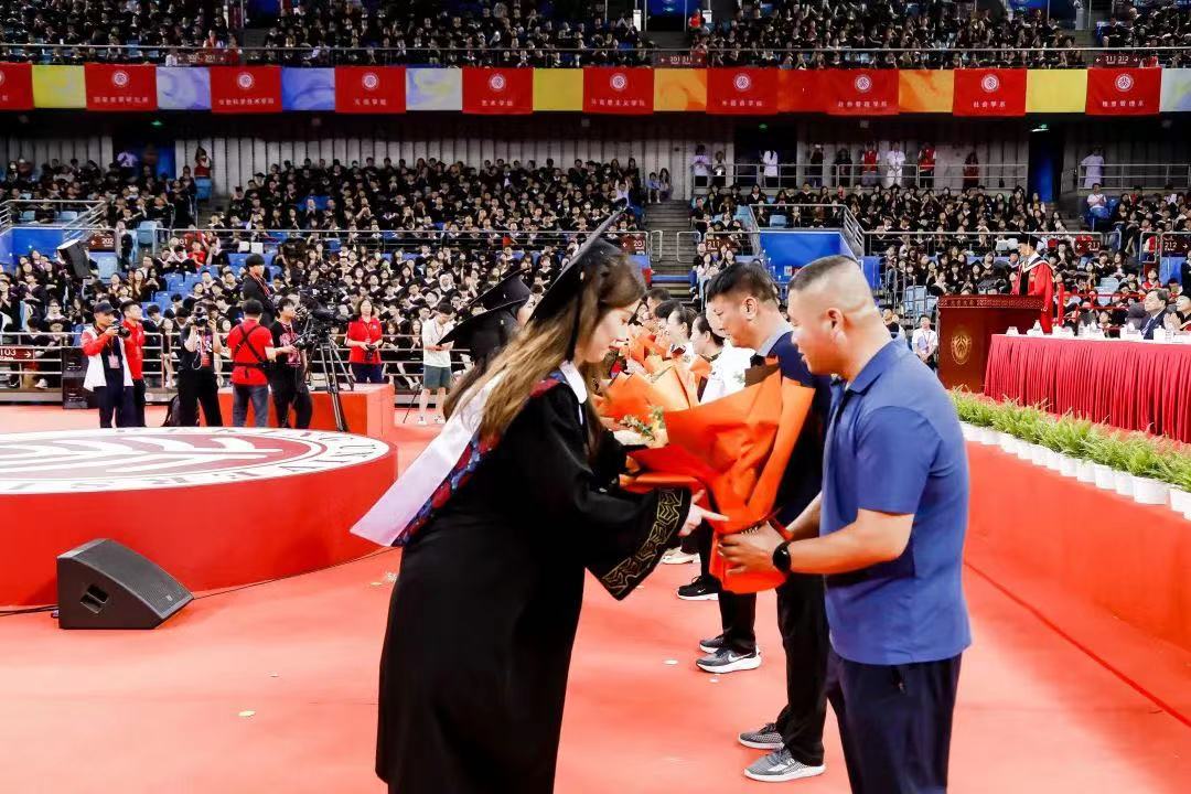 同學(xué)們今天學(xué)有所成,離不開很多人的陪伴與支持。老師、輔導(dǎo)員、教務(wù)員、醫(yī)護(hù)人員、志愿者、保安、樓長、食堂師傅和保潔阿姨為畢業(yè)生們送上一句句溫暖的關(guān)懷和真摯的祝福,看著一張張熟悉的面龐,聽著伴隨自己度過四年時(shí)光的熟悉聲音,畢業(yè)生代表向教學(xué)科研及教輔人員、醫(yī)護(hù)人員及抗疫志愿者、保安員、學(xué)生輔導(dǎo)員、廚師及餐飲服務(wù)人員、后勤服務(wù)保障人員代表獻(xiàn)花,感謝全體教職員工的辛勤付出,表達(dá)對他們的感恩和愛戴之心。
