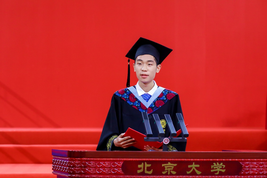 畢業(yè)生代表、物理學(xué)院2019級天文學(xué)系本科生王子銘分享了自己探索星空的經(jīng)歷。他認(rèn)為,在北大,有許多重要的事情看不見但聽得到,正是這些無形的聲音一次次幫他找回信心,給予他繼續(xù)前進(jìn)的勇氣和底氣。在今后的旅途中,我們?nèi)詴龅嚼щy、感到迷茫,那時(shí),我們更應(yīng)該仔細(xì)聆聽心中堅(jiān)定求知、不斷求索的聲音。