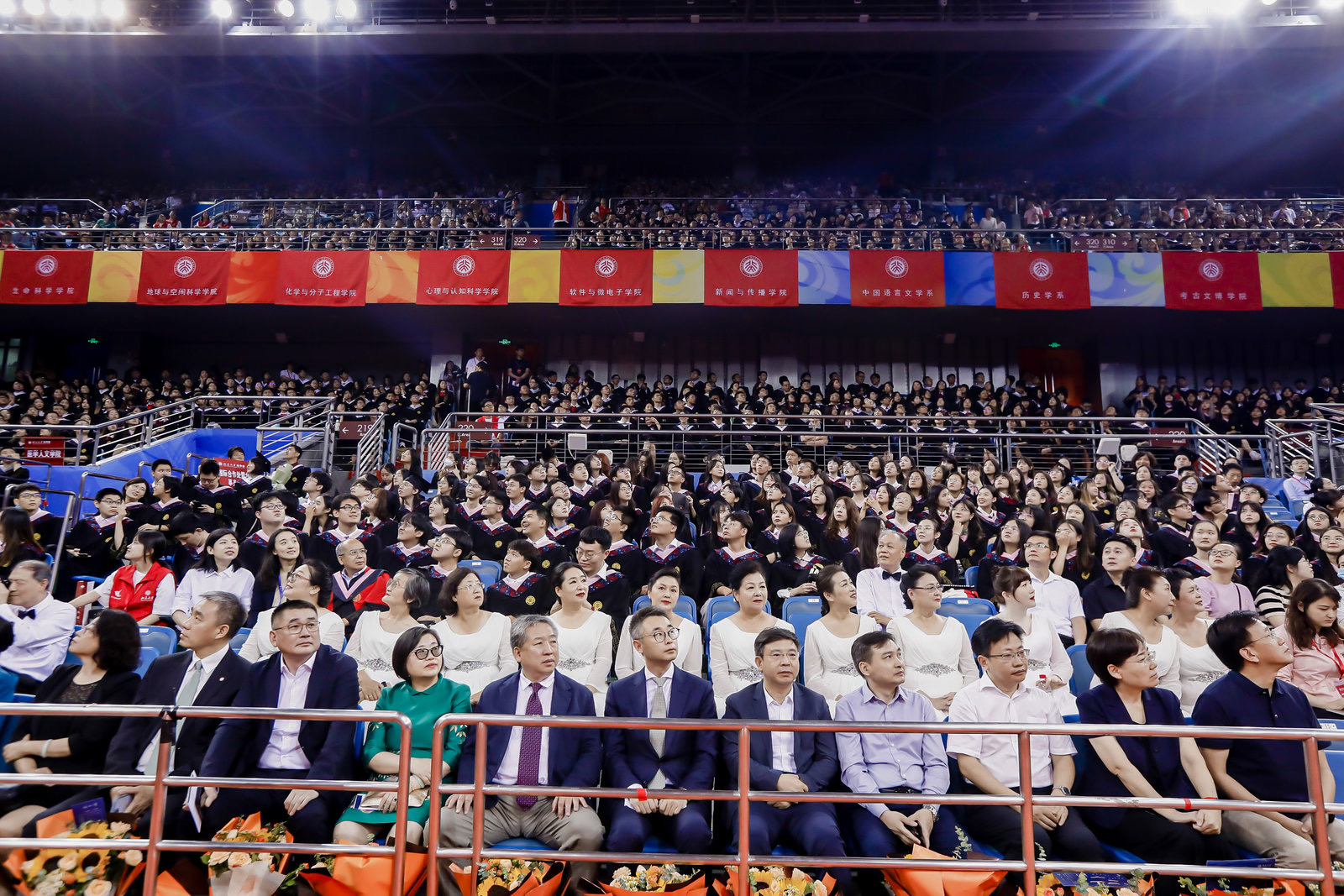 北京市委常委、教育工委書記游鈞,北京市委教育工委副書記、市教委主任李奕,北京大學(xué)黨委書記郝平教授、校長龔旗煌院士等學(xué)校領(lǐng)導(dǎo),教師代表中國科學(xué)院院士、北京大學(xué)李兆基講席教授、理學(xué)部主任謝曉亮,北京大學(xué)博雅講席教授、哲學(xué)系朱良志,中國科學(xué)院院士、北京大學(xué)生命科學(xué)學(xué)院趙進(jìn)東,北京大學(xué)公共衛(wèi)生學(xué)院院長詹思延教授,以及外籍專家代表北京大學(xué)哲學(xué)系助理教授、研究員王小塞博士,各學(xué)部、各院系的老師們,中學(xué)校長、校友與4239名2023屆本科畢業(yè)生、100余名往屆本科畢業(yè)生來到典禮現(xiàn)場,共同見證本科畢業(yè)這一人生中的重要時(shí)刻。畢業(yè)生家人和親友通過現(xiàn)場觀看和視頻直播的方式同步參加。畢業(yè)典禮由北京大學(xué)黨委常委、副校長、教務(wù)長王博主持。