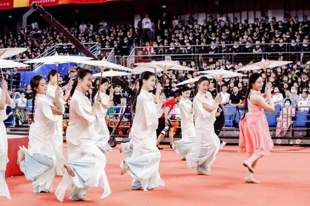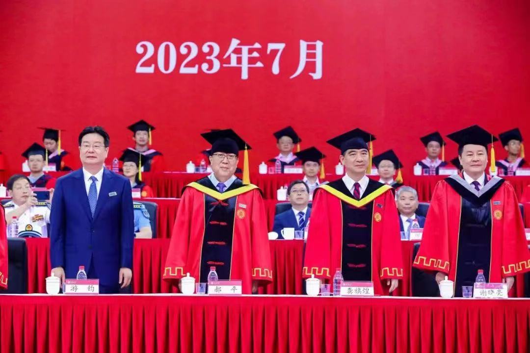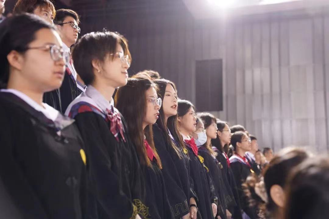 畢業(yè)典禮在國歌聲中拉開了帷幕,全體師生高唱國歌,用嘹亮的歌聲向建黨102周年獻(xiàn)禮。