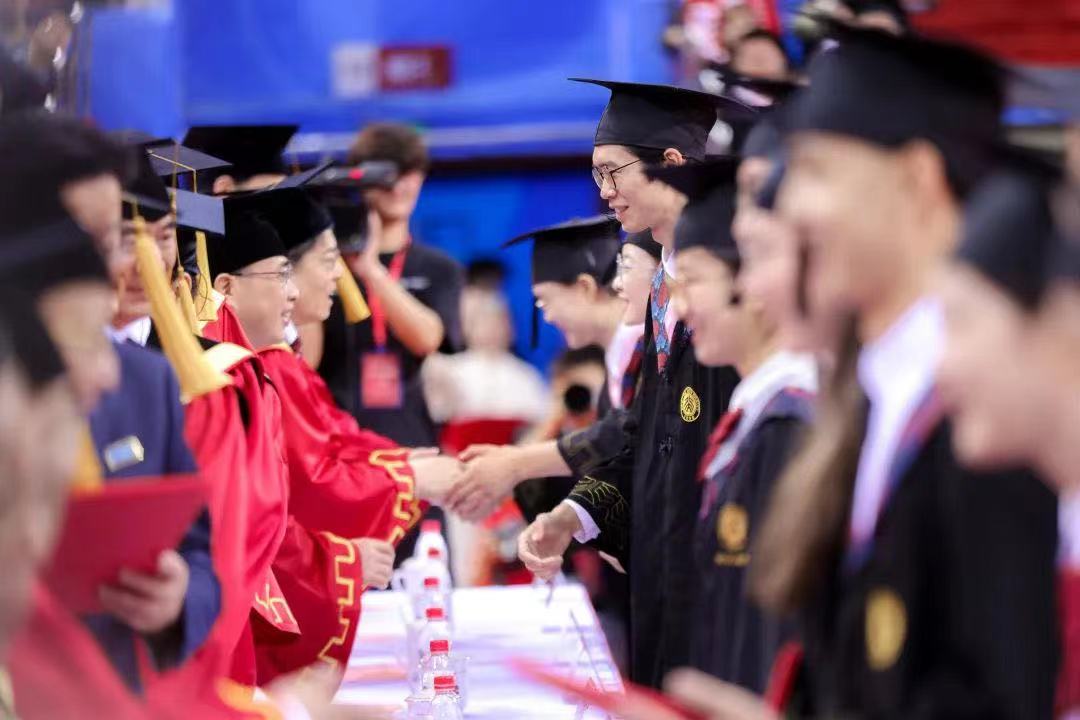 作為北京大學(xué)學(xué)位評定委員會主席,龔旗煌以院系為單位宣布授予2023屆本科畢業(yè)生學(xué)士學(xué)位。“信以通達(dá),管則治世”“國家發(fā)展,發(fā)展國家”“尚自然展個(gè)性,化孤獨(dú)為共同”“萬卷詩書堪用世,一塔湖圖總故鄉(xiāng)”“網(wǎng)系四海,云聯(lián)八方,信息科學(xué),強(qiáng)國興邦”……畢業(yè)生們高喊院系口號,為本科的學(xué)習(xí)生活畫上句點(diǎn),向著未知又充滿希望的前路揚(yáng)帆遠(yuǎn)航。