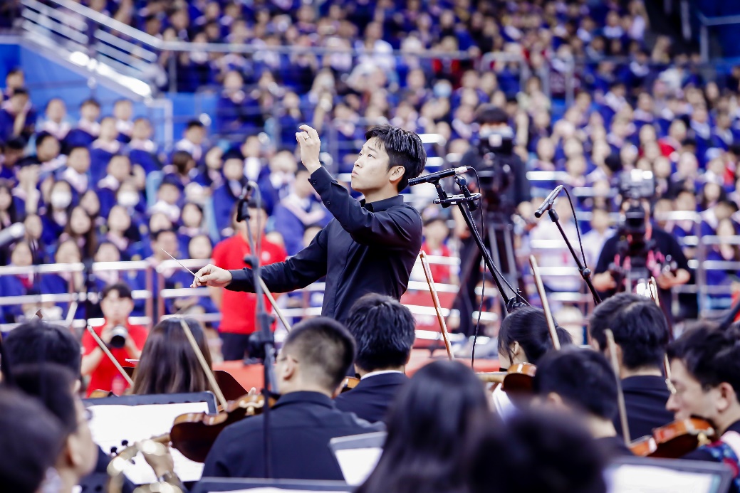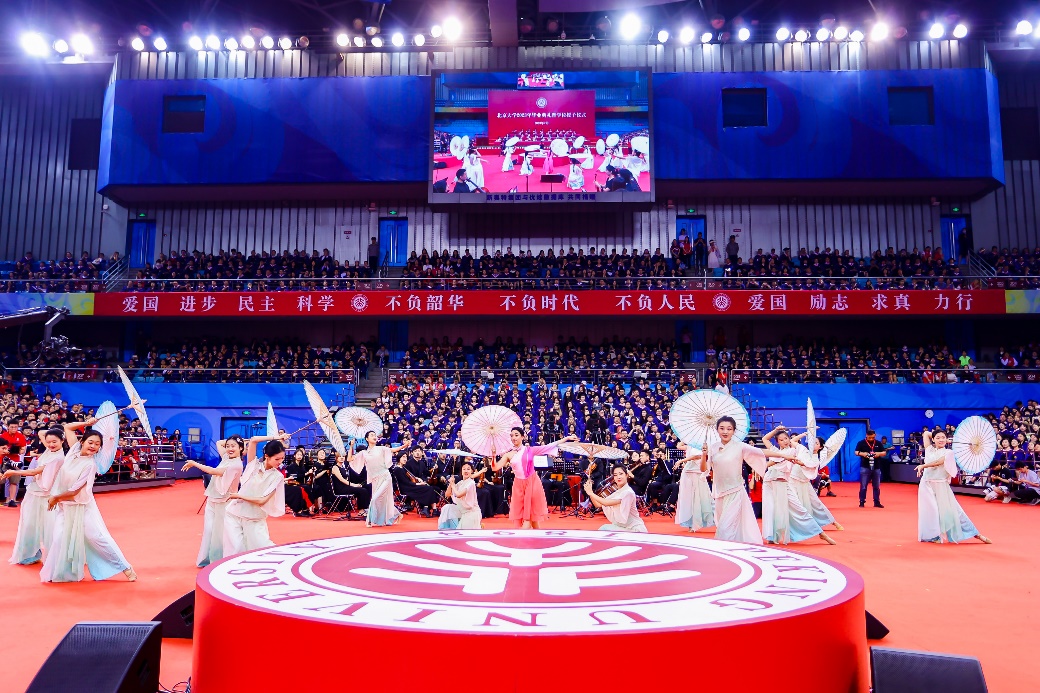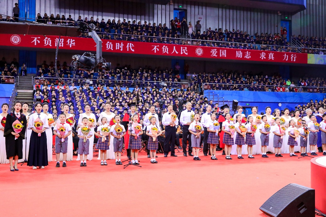 歌聲振人心,鼓點引征程。在暖場表演環(huán)節(jié)中,由北京大學學生代表和附屬幼兒園學生代表帶來的創(chuàng)意編排《鼓韻·不怕不怕》引起了觀眾的陣陣喝彩;由北京大學學生交響樂團和附屬中學管樂團帶來的《瑤族舞曲》洋溢著歡快的民族舞曲色彩;由畢業(yè)生代表和在校生代表聯(lián)袂演出的畢業(yè)祝福歌曲聯(lián)唱,唱出了同學們對母校和師友的祝福與不舍;由北京大學學生舞蹈團畢業(yè)生代表帶來的舞蹈《雨憶季夏》仿佛將時光定格在微風陣陣的未名湖畔,難言夏季的離別;由附屬幼兒園、附屬小學、教工合唱團共同唱響的《我和我的祖國》,表達了北大師生的愛國情懷。
