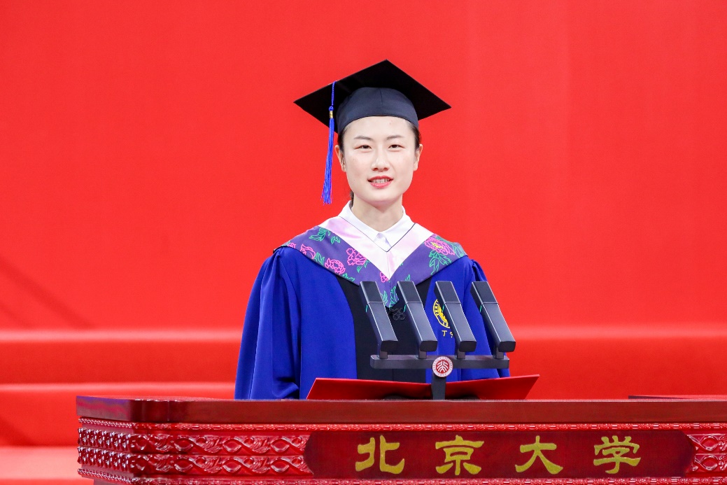 畢業(yè)生代表體育教研部2021級碩士研究生丁寧回顧了她從職業(yè)運動員到北大學子的心路歷程。從一路收獲冠軍與榮耀的中國乒乓球隊員到北京大學研究生學子,身份的轉(zhuǎn)變讓她面臨著未知的挑戰(zhàn),但北大開放包容的學風、多元豐富的課程以及師長前輩細心的教導讓她更加自信。臨別之際,丁寧寄語即將奔赴五湖四海的北大學子,要永不停止追逐的步伐,追夢追光,不負時代。