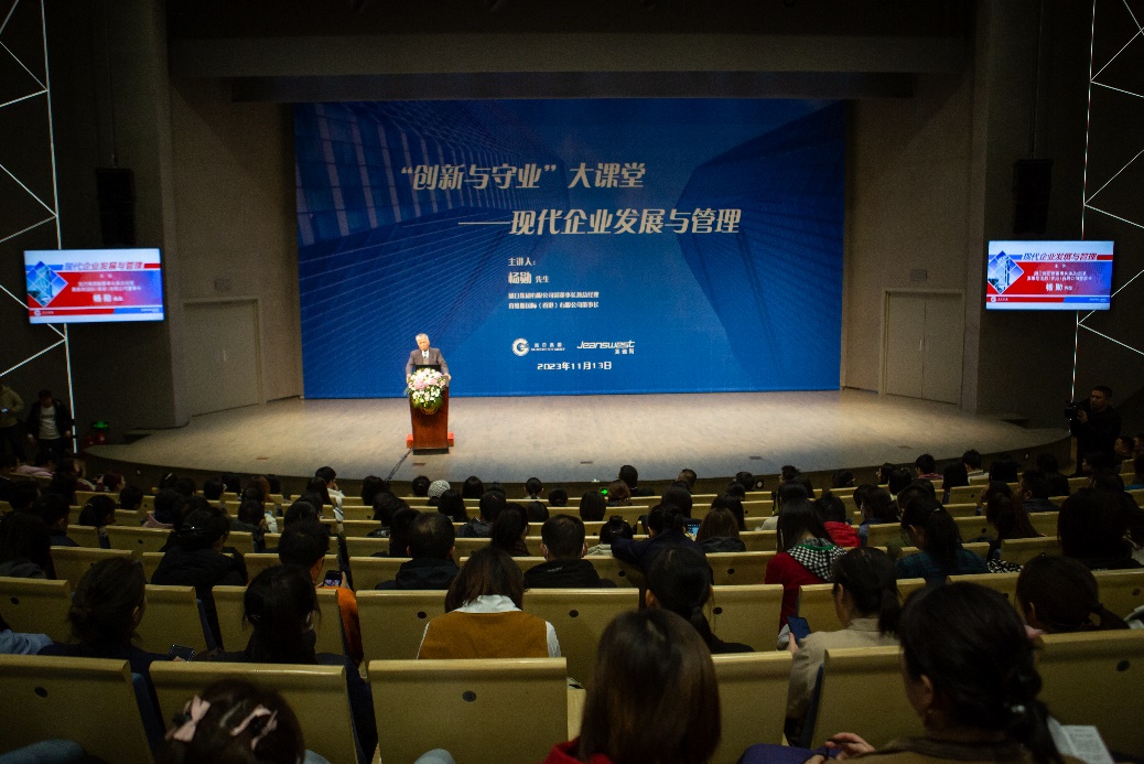 捐贈(zèng)儀式前,由北京大學(xué)會(huì)議中心、創(chuàng)新創(chuàng)業(yè)學(xué)院主辦,楊勛以“創(chuàng)新與守業(yè)大課堂——現(xiàn)代企業(yè)發(fā)展與管理”為題在講堂李瑩廳為300余名師生講述了旭日集團(tuán)創(chuàng)業(yè)、守業(yè)故事。現(xiàn)場觀眾積極互動(dòng),氣氛熱烈。