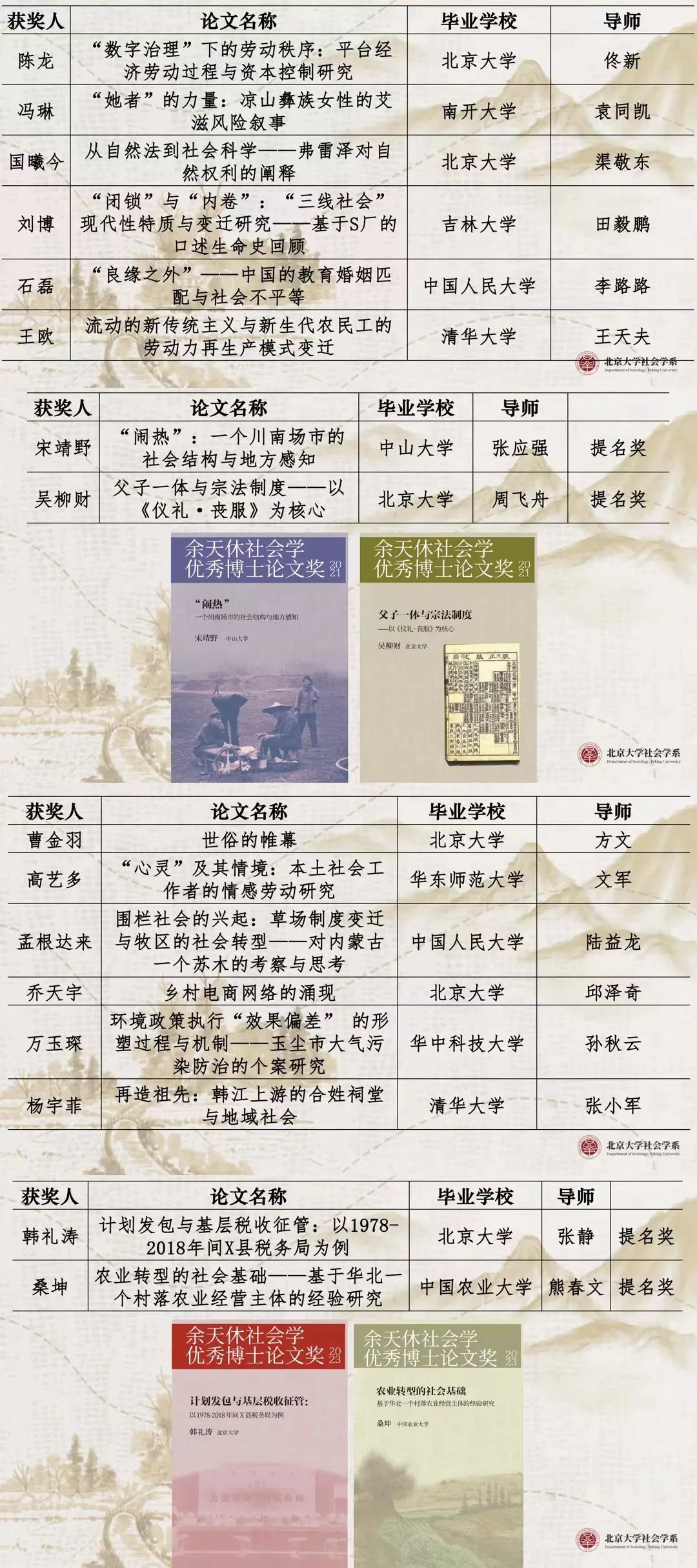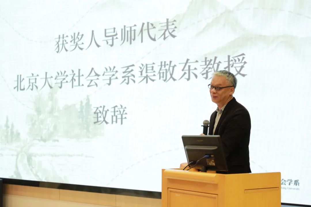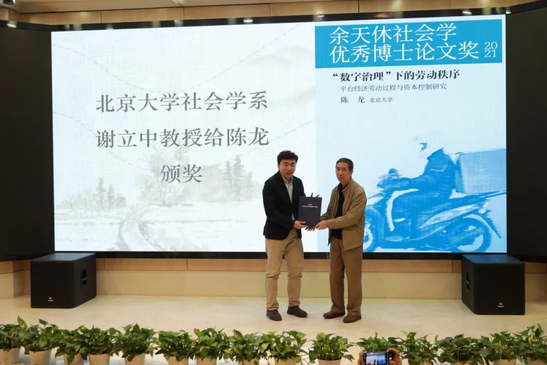 北京大學(xué)社會(huì)學(xué)系各位老師依次宣讀頒獎(jiǎng)詞,并為各位獲獎(jiǎng)人頒獎(jiǎng)。謝立中肯定了陳龍博士的論文是一篇富有創(chuàng)造力、在田野方法上深具社會(huì)學(xué)色彩的研究;劉愛玉贊揚(yáng)了馮琳博士論文的溫度和人文價(jià)值;王銘銘肯定了國(guó)曦今博士將人類學(xué)經(jīng)典帶入社會(huì)思想史的努力;佟新肯定了劉博博士扎實(shí)的資料工作和強(qiáng)烈的現(xiàn)實(shí)關(guān)懷;李建新贊揚(yáng)了石磊博士對(duì)推動(dòng)社會(huì)分層和流動(dòng)研究做出的貢獻(xiàn);劉能指出王歐博士論文對(duì)勞動(dòng)再生產(chǎn)模式分析視角的拓展和對(duì)社會(huì)學(xué)中國(guó)化的貢獻(xiàn);李康肯定了曹金羽博士對(duì)社會(huì)理論歐洲根源的深度探究;孫飛宇贊揚(yáng)了高藝多博士論文敏銳的問(wèn)題意識(shí)和詳實(shí)的田野資料;陶林認(rèn)可了孟根達(dá)來(lái)博士在理論和個(gè)案擴(kuò)展上的貢獻(xiàn);周云肯定了喬天宇博士將網(wǎng)絡(luò)分析應(yīng)用于中國(guó)經(jīng)驗(yàn)的社會(huì)學(xué)案例研究的努力;周皓贊揚(yáng)了萬(wàn)玉琛博士對(duì)政策錯(cuò)配影響機(jī)制分析視野和框架的拓寬;方文肯定了楊宇菲博士在人類學(xué)理論方法上的傳承和創(chuàng)新。