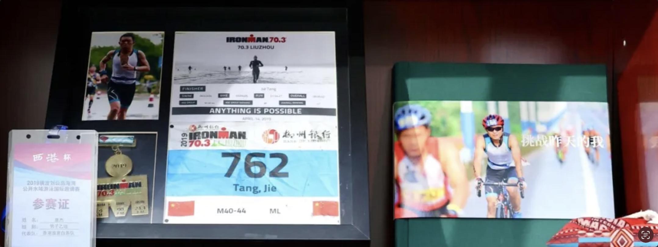 唐杰辦公室里擺放著他參加鐵人三項(xiàng)、馬拉松等比賽的獎(jiǎng)牌和照片