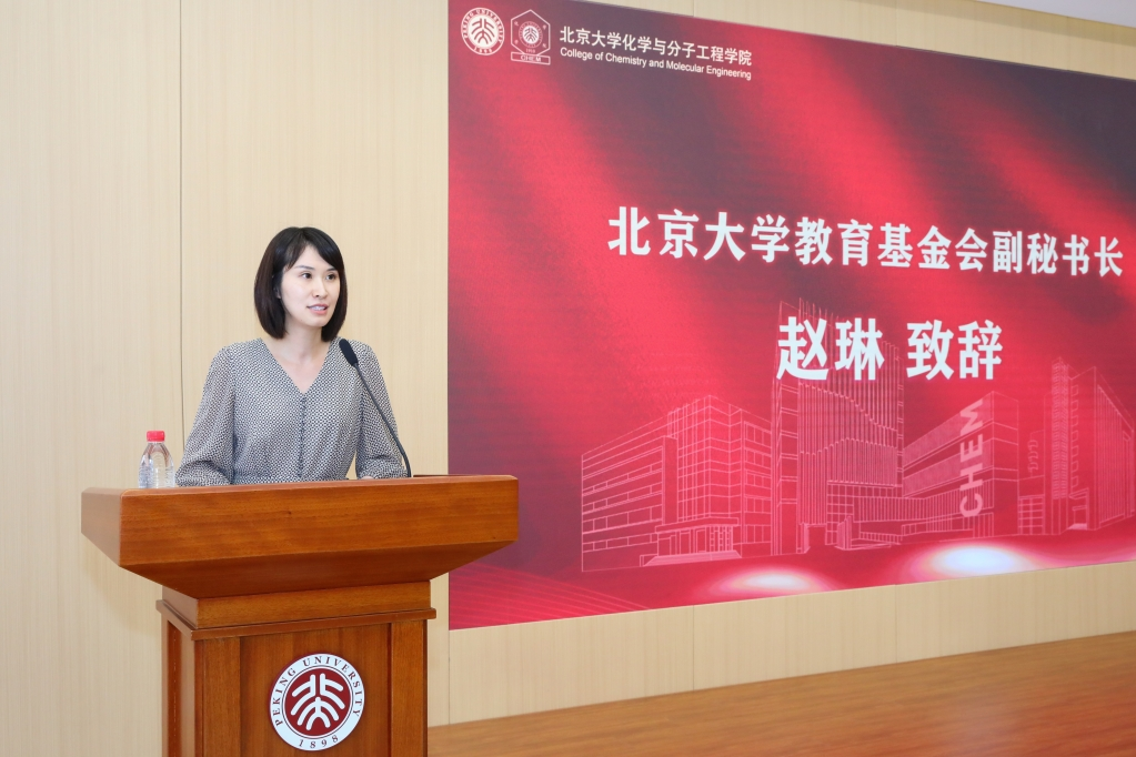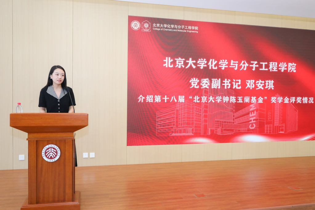 鄧安琪介紹了第十八屆“北京大學(xué)鐘陳玉蘭基金”的評獎情況。今年,化學(xué)學(xué)院共評選出19位品學(xué)兼優(yōu)的在讀研究生獲得鐘陳玉蘭獎學(xué)金,其中一等獎2人、二等獎6人、三等獎11人,總獎金額達5萬元。同時,化學(xué)學(xué)院按照教學(xué)科研、管理崗位分別提名,評選出4位教師獲獎。鄧安琪表示,在鐘氏夫婦精神的激勵下,更多的學(xué)子和教師將繼續(xù)努力,為化學(xué)事業(yè)的發(fā)展貢獻力量。