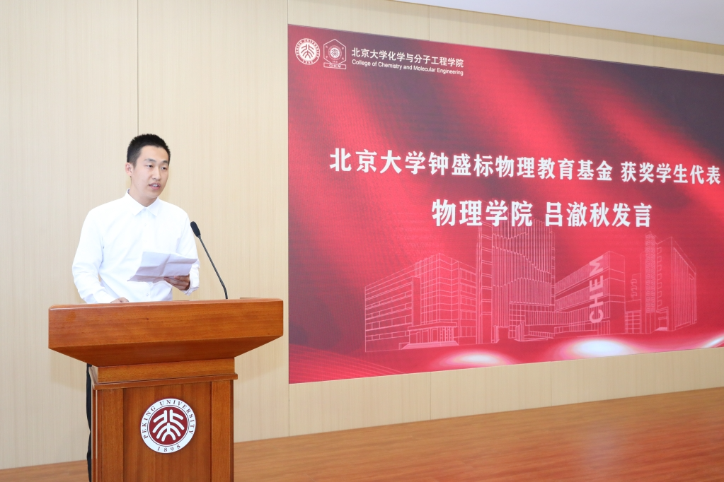 物理學(xué)院獲獎同學(xué)代表呂澈秋代表所有獲獎學(xué)生感謝鐘氏夫婦的慷慨捐贈和支持。他表示,他將繼續(xù)秉承鐘盛標先生的精神,不斷探索未知,勇于創(chuàng)新,為科研報國貢獻力量。
