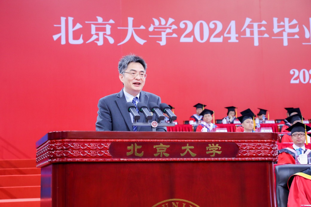 離別之際,作為校長(zhǎng)和校學(xué)位評(píng)定委員會(huì)主席,龔旗煌為畢業(yè)生們送上深情的寄語(yǔ)和美好的祝福。他指出,同學(xué)們?cè)诒贝罅粝铝俗蠲篮玫那啻河洃洠斋@了求知的熱情與學(xué)習(xí)的方法,培養(yǎng)了獨(dú)立思考的習(xí)慣與團(tuán)隊(duì)合作的經(jīng)驗(yàn),更以青春熱情投入北大的發(fā)展建設(shè)中,成為北大新發(fā)展歷程的見(jiàn)證者、推動(dòng)者和貢獻(xiàn)者。他表示,今年是新中國(guó)成立75周年,也是五四運(yùn)動(dòng)105周年。十年前,習(xí)近平總書(shū)記在北大考察時(shí)指出,青年是標(biāo)志時(shí)代最靈敏的晴雨表,每一代青年都有自己的機(jī)遇和機(jī)緣,都要在自己所處的時(shí)代條件下謀劃人生、創(chuàng)造歷史。今天,同學(xué)們即將開(kāi)啟人生新階段,新的時(shí)代使命也在召喚著大家。作為新時(shí)代的新青年,同學(xué)們是承前啟后、繼往開(kāi)來(lái)的一代人,大家的人生理想和價(jià)值追求,將決定中國(guó)式現(xiàn)代化的萬(wàn)千氣象。