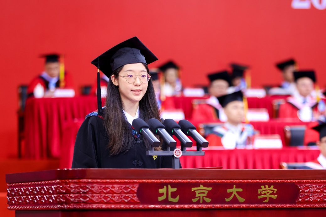 畢業(yè)生代表、數(shù)學(xué)科學(xué)學(xué)院2020級(jí)本科生馮宣瑞是2020年開(kāi)學(xué)時(shí)數(shù)學(xué)科學(xué)學(xué)院第一位報(bào)到的新生,他將自己的大學(xué)四年比作圓周率“π”——看起來(lái)毫無(wú)規(guī)律,卻充滿無(wú)限可能。四年間,他文理兼修,大膽探索,既在攀登數(shù)學(xué)高峰的路上穩(wěn)扎穩(wěn)打,又徜徉于文學(xué)殿堂、觸摸北大人文精神。站在畢業(yè)的路口,他從容而自信地表示,自己將用開(kāi)放的心態(tài)坦然擁抱千變?nèi)f化的生活。