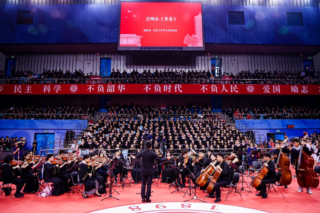 典禮開(kāi)始前,來(lái)自北京大學(xué)附屬幼兒園、學(xué)生交響樂(lè)團(tuán)、學(xué)生舞蹈團(tuán)、學(xué)生合唱團(tuán)和教工合唱團(tuán)的老師、同學(xué)們,以及部分畢業(yè)生代表帶來(lái)了精彩紛呈的歌舞表演,將現(xiàn)場(chǎng)氣氛盡數(shù)點(diǎn)燃。在歌曲《青春大概》的疑問(wèn)中交出答卷,隨著舞蹈《我們的歌》,回溯美好校園時(shí)光。《扇武飛揚(yáng)》,飛揚(yáng)少年壯志;《月光小夜曲》,低吟離別感傷。多語(yǔ)種聯(lián)唱《但愿人長(zhǎng)久》,是對(duì)畢業(yè)生們最真摯的祝福,此去長(zhǎng)風(fēng)萬(wàn)里,愿每一位畢業(yè)生都能《一路生花》。