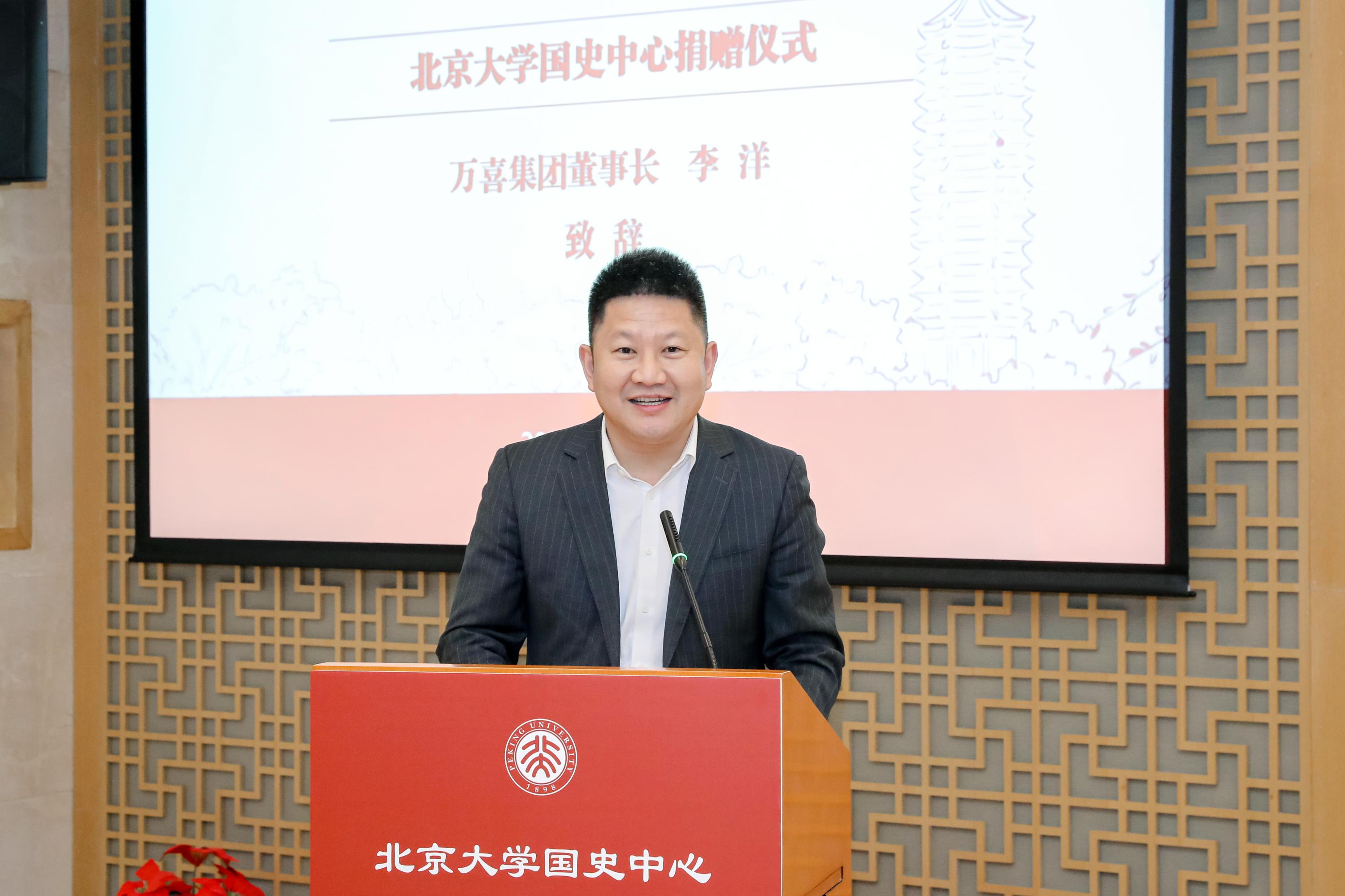 李洋介紹了近年來萬喜餐飲集團的發(fā)展成績,分享了當初在北大求學的初心,表達了多年來始終持有的對歷史的愛與敬意。他表示,捐資支持國史中心的發(fā)展具有重要意義,相信中心將在歷史文化資料的發(fā)掘、保存、研究和宣傳教育的道路上不斷攀登新的高峰,為傳承和弘揚中華優(yōu)秀歷史文化作出更大貢獻。