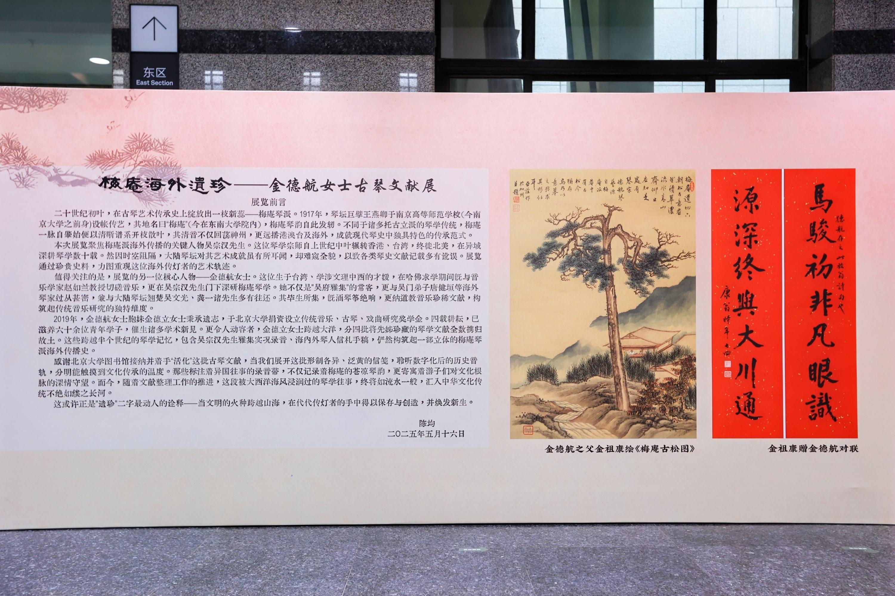 5月16日下午,《梅庵海外遺珍——金德航女士古琴文獻(xiàn)展》開幕式在北京大學(xué)圖書館華彩展廳舉行。此次展覽由北京大學(xué)藝術(shù)學(xué)院、北京大學(xué)圖書館主辦,北京大學(xué)昆曲傳承與研究中心承辦,北京大學(xué)教育基金會、北京大學(xué)會議中心協(xié)辦,藝術(shù)學(xué)院陳均教授策展,以金德立捐贈的梅庵派古琴家金德航古琴文獻(xiàn)為基礎(chǔ),以金德航與其師古琴大家吳宗漢、王憶慈伉儷以及音樂學(xué)家趙如蘭、古琴家唐健垣等人的通信為中心,并展示“吳府雅集”等古琴音像信息,從而呈現(xiàn)了一幅立體的古琴藝術(shù)海外傳播史。展覽中,金祖康為女兒金德航特別繪制的《梅庵古松圖》,以及信札中所附的梅庵前的六朝松明信片、六朝松老照片,體現(xiàn)了海外游子對以古琴文化為代表的中華優(yōu)秀傳統(tǒng)文化的眷戀之情。此次展覽特別約請音樂學(xué)家田青、文化學(xué)者鄭培凱、著名琴家丁承運、金蔚、楊典題詞和治印,堪稱紙上雅集。
