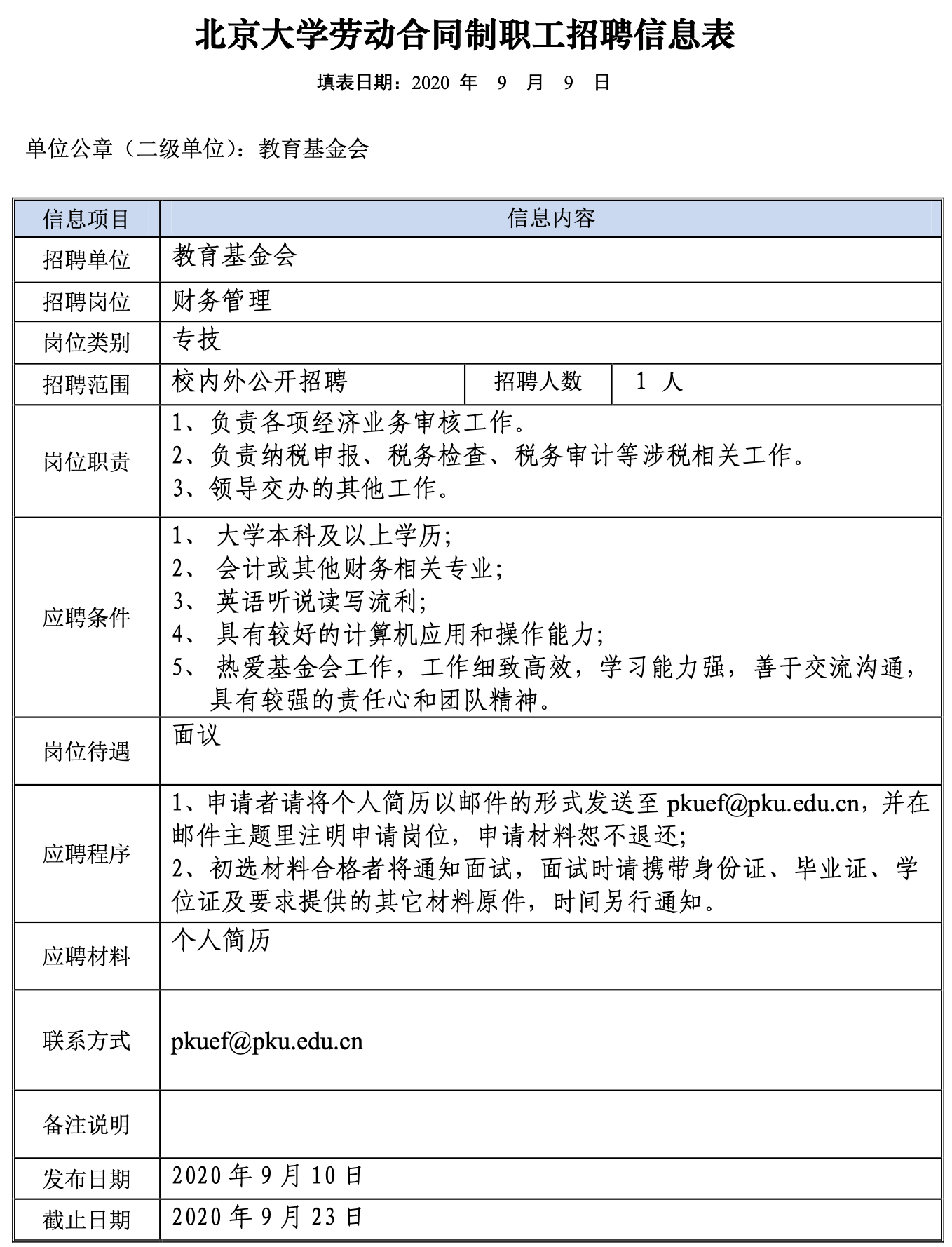 因工作需要,北京大學(xué)教育基金會面向校內(nèi)外公開招聘勞動合同制職工1名。