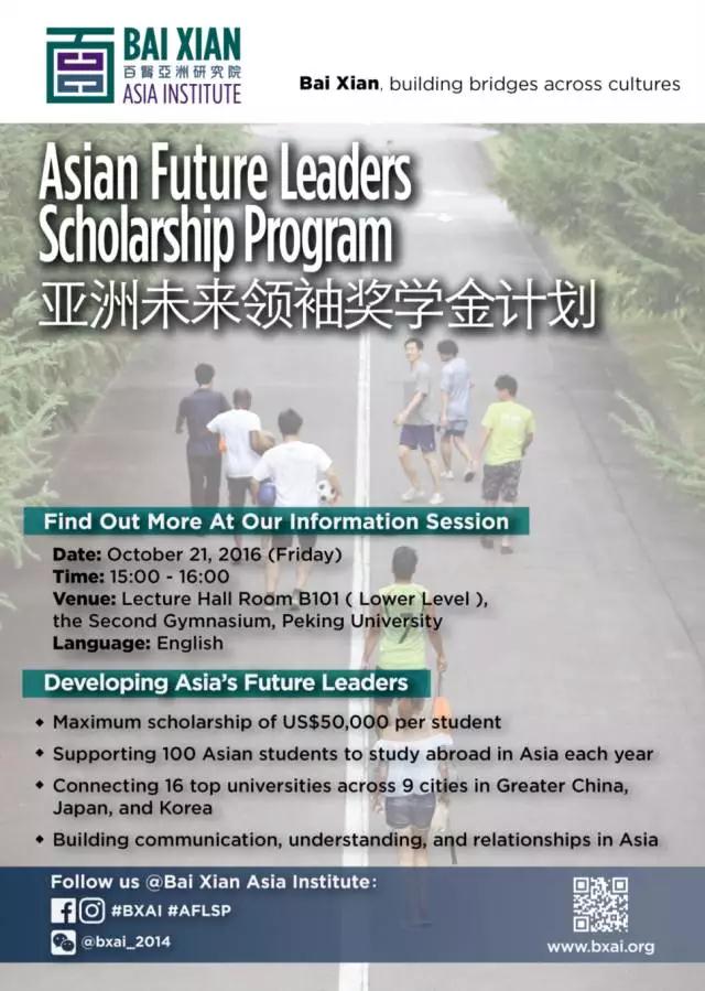 香港百賢亞洲研究院將于2016年10月21日在北京大學(xué)舉行“亞洲未來(lái)領(lǐng)袖獎(jiǎng)學(xué)金計(jì)劃”(AFLSP)宣講會(huì),屆時(shí)將有百賢亞洲研究院工作人員對(duì)獎(jiǎng)學(xué)金計(jì)劃情況進(jìn)行詳細(xì)介紹。歡迎廣大同學(xué)特別是正在北大就讀的日本留學(xué)生和有意到日、韓兩國(guó)及臺(tái)灣地區(qū)深造的中國(guó)學(xué)生踴躍參與。