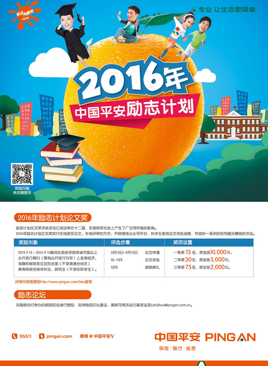 近日,北京大學(xué)教育基金會(huì)接到2016年度平安勵(lì)志計(jì)劃申請啟動(dòng)的重要通知。本年度,中國平安集團(tuán)將開展以下項(xiàng)目: