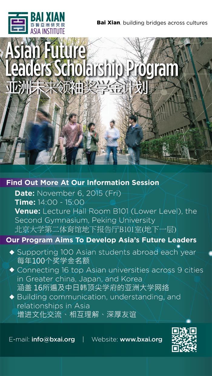 香港百賢亞洲研究院將于2015年11月6日在北京大學(xué)舉行“亞洲未來領(lǐng)袖獎(jiǎng)學(xué)金計(jì)劃”(AFLSP)宣講會(huì),屆時(shí)將有百賢亞洲研究院工作人員對(duì)獎(jiǎng)學(xué)金計(jì)劃情況進(jìn)行詳細(xì)介紹。歡迎廣大同學(xué)特別是正在北大就讀的日本留學(xué)生和有意到日、韓兩國及臺(tái)灣地區(qū)深造的中國學(xué)生踴躍參與。