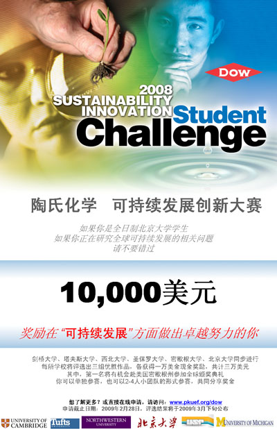 2008年,陶氏化學公司(DOW)捐資在北京大學設立“陶氏化學可持續(xù)發(fā)展創(chuàng)新大賽”項目。本創(chuàng)新大賽獎金將用于我校獎勵在可持續(xù)發(fā)展創(chuàng)新研究中有杰出成果、品行端正、綜合能力強的在校學生,共3名,每位獎金為美元壹萬元(USD10,000)。