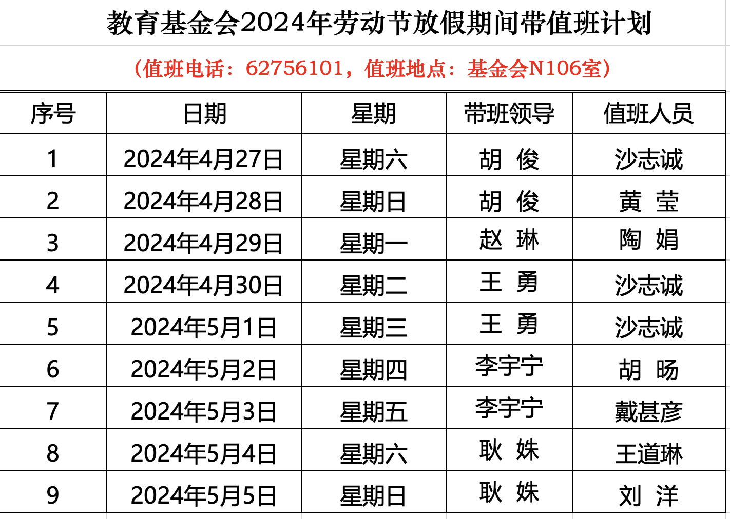 根據(jù)學(xué)校《關(guān)于做好2024年勞動節(jié)放假期間帶值班工作的通知》,北京大學(xué)教育基金會現(xiàn)將2024年勞動節(jié)放假期間帶值班計(jì)劃公布如下: