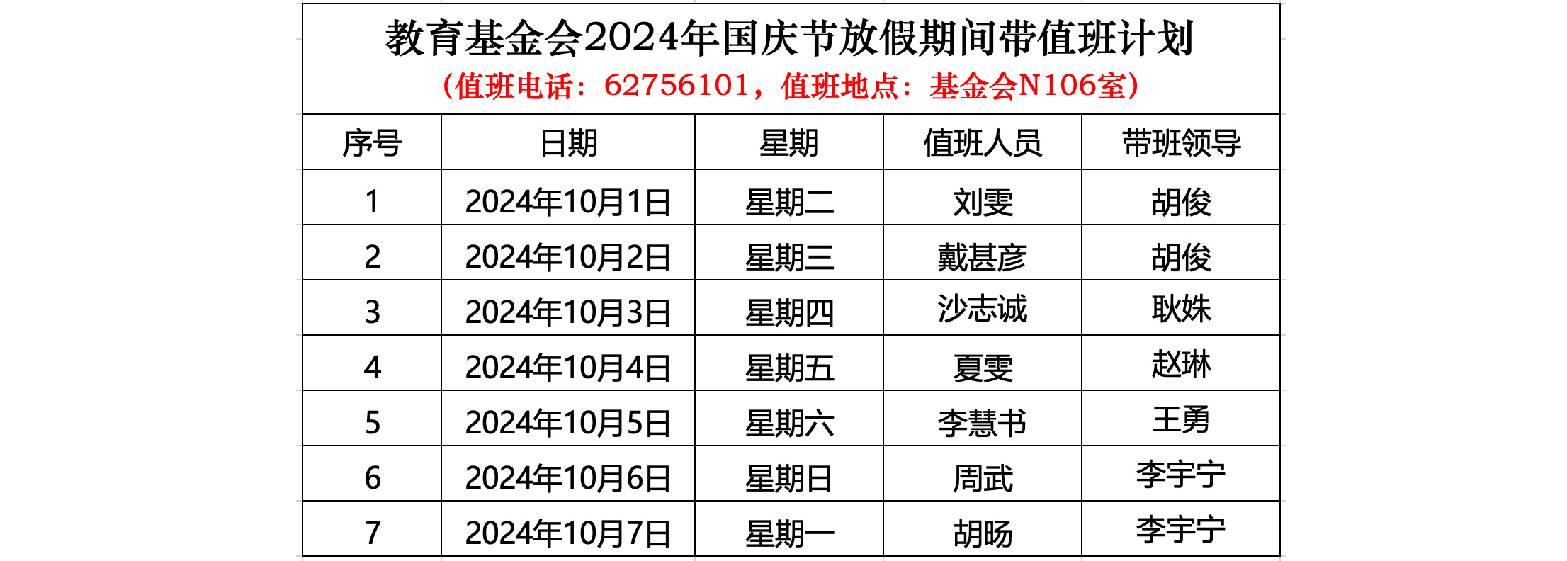 教育基金會(huì)2024年國(guó)慶節(jié)放假期間帶值班計(jì)劃