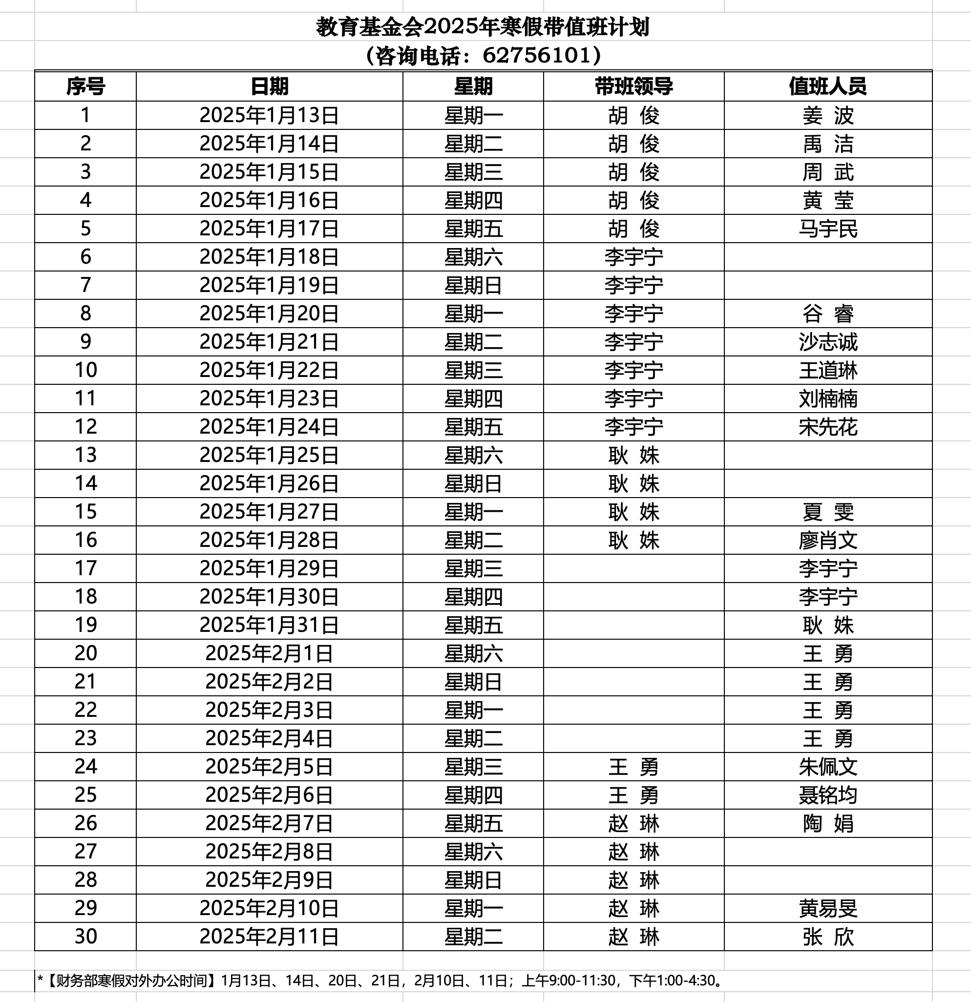 根據(jù)學(xué)校《關(guān)于做好寒假和春節(jié)期間工作的通知》,北京大學(xué)教育基金會(huì)現(xiàn)將2025年寒假帶值班計(jì)劃公布如下: