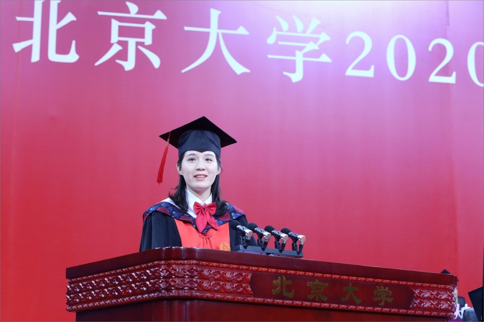 畢業(yè)生代表、口腔醫(yī)學(xué)院2020屆博士畢業(yè)生張一凡回顧了一年來(lái)的收獲成長(zhǎng)與心路歷程。總書(shū)記在回信中對(duì)“90后”的諄諄囑托,老師們的耐心指導(dǎo)與親切叮嚀,讓她感受到北大人那份不變的責(zé)任與擔(dān)當(dāng);博士后期間經(jīng)歷的困難與挑戰(zhàn)讓她對(duì)“行百里者半九十,愈是難時(shí),就愈要堅(jiān)定”有了更深的理解;從電視劇《覺(jué)醒年代》中,更是感受到北大與黨和國(guó)家前途命運(yùn)始終同頻共振、同向同行。“今天,青年們已接過(guò)前輩的接力棒,將不負(fù)母校所托,繼續(xù)奮斗與成長(zhǎng),讓青春之花絢麗綻放在黨和人民最需要的地方。”