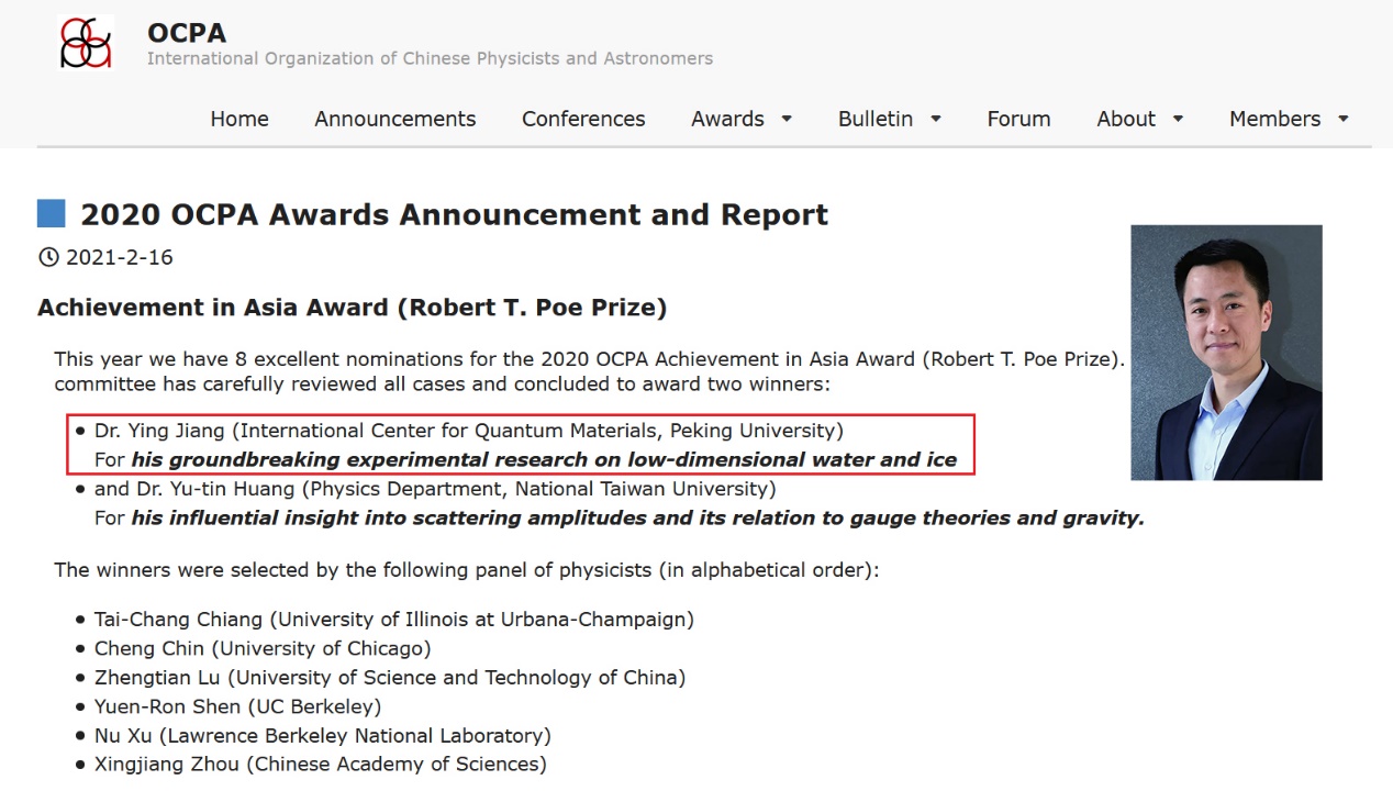 近日,北京大學(xué)物理學(xué)院量子材料科學(xué)中心江穎教授被全球華人物理與天文學(xué)會(International Organization of Chinese Physicists and Astronomers, OCPA)授予2020年度“亞洲成就獎”(Achievement in Asia Award (AAA),Robert T. Poe Prize),以表彰他“在低維水和冰的實(shí)驗(yàn)研究方向的開創(chuàng)性貢獻(xiàn)”(For his groundbreaking experimental research on low-dimensional water and ice),其具體貢獻(xiàn)包括:發(fā)展了對氫原子敏感的掃描探針顯微術(shù),獲得了世界首張亞分子級分辨的水分子圖像,并揭示了水的核量子效應(yīng),發(fā)現(xiàn)了水合離子的幻數(shù)效應(yīng),實(shí)驗(yàn)證實(shí)了二維冰的存在等。
