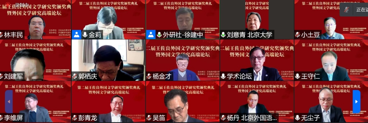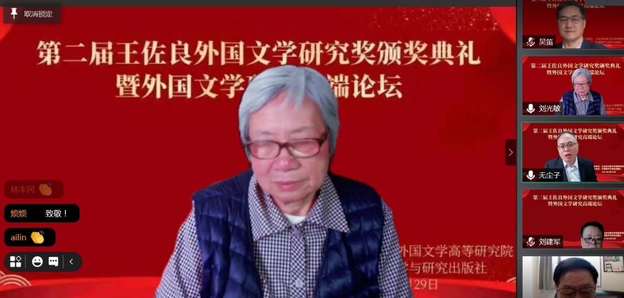 王佐良外國文學高等研究院院長、評獎委員會主席金莉教授介紹了評選工作的開展情況,60名初評專家選出了16部作品進入第二輪評選,最終8部作品進入終評,第三輪的終評專家又經過三輪投票最終確定獲獎名單。仲躋昆教授撰寫的《阿拉伯文學史》摘得本屆大獎的桂冠。