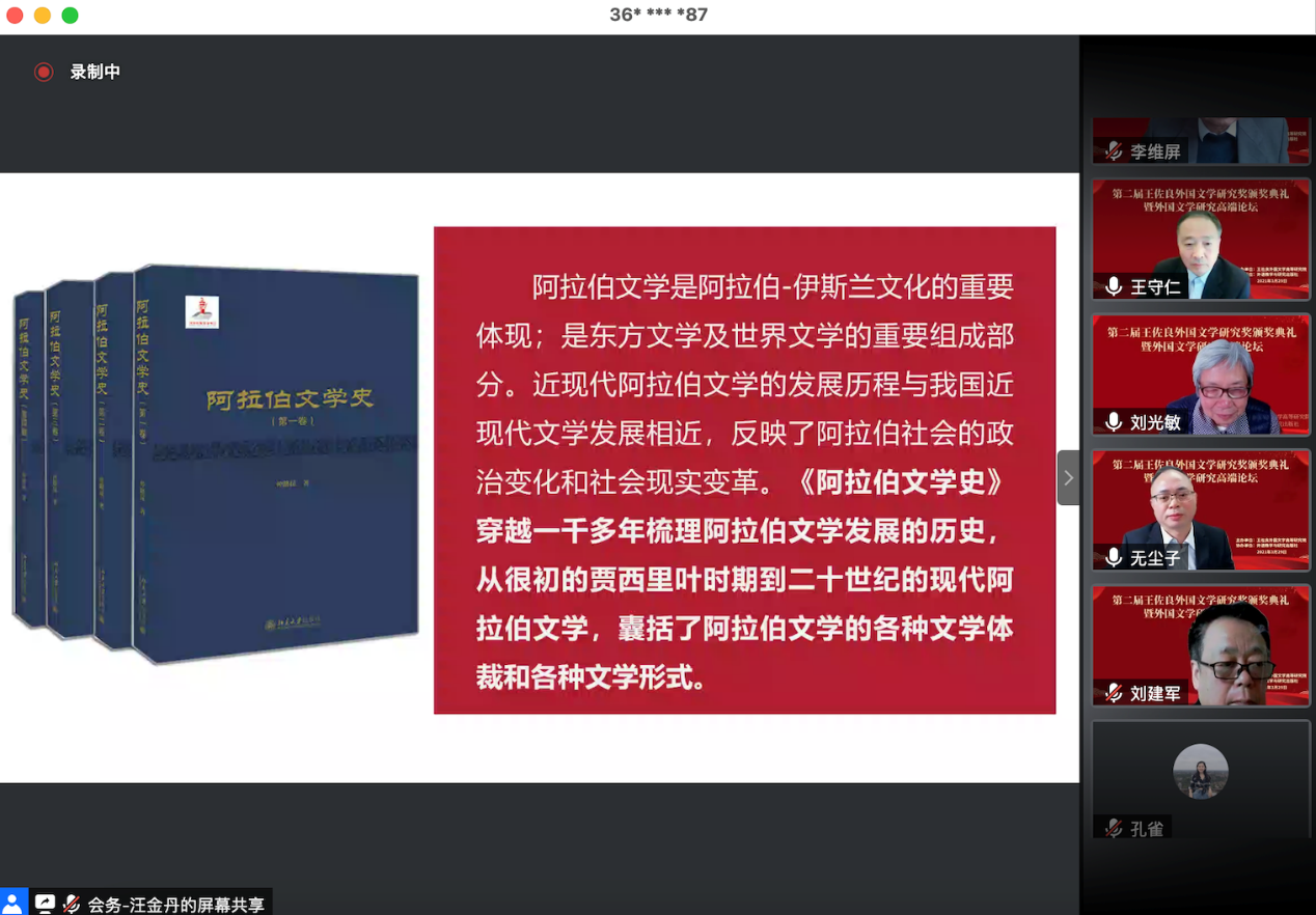 仲躋昆夫人劉光敏代表于2020年4月去世的仲躋昆發(fā)表了感言。她表示,《阿拉伯文學史》是仲躋昆近20部著作和譯作當中最為重要的一部。她講述了仲躋昆生前熱愛詩歌、熱愛朗誦、熱愛翻譯、熱愛學術研究的點滴,并朗誦了一首仲躋昆翻譯的紀伯倫作品《花之歌》。