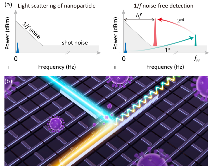 (a)1/f 噪聲抑制機(jī)制;(b)基于片上波導(dǎo)暗場(chǎng)外差干涉儀的單顆粒檢測(cè)