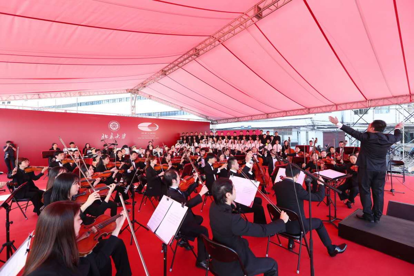 來自國家大劇院管弦樂團的藝術家,北京大學教職工合唱團、學生合唱團的師生,以及部分學生社團的同學們?yōu)榇蠹規(guī)砹司实呐瘓霰硌荨!拔疵希┭潘拢覀兗磳⒃谘鄨@度過充實而豐富的青春時光。”一段開場視頻帶領新生們回顧了抗擊疫情、入學報到、軍訓及新生教育的場景。