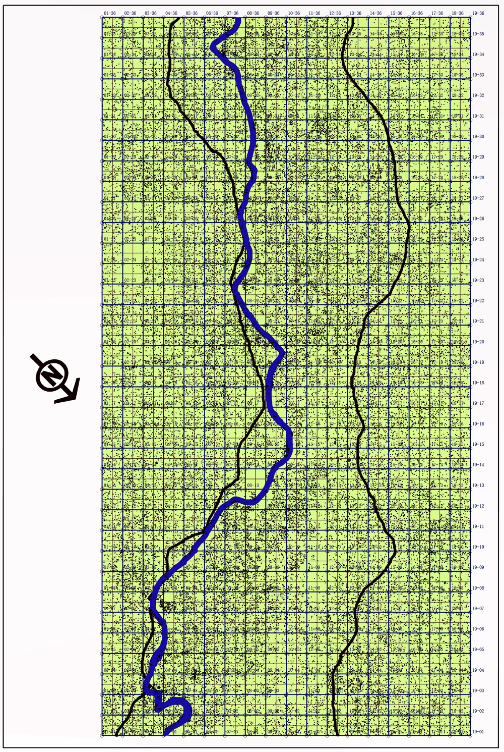 王朗樣地掛牌樹木植株的空間分布(藍色線條為縱貫樣地的河流,黑色線條為河谷平地兩側的坡基線)