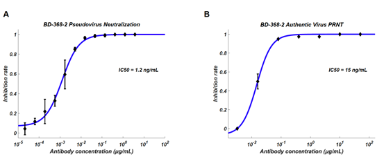 BD-368-2抗體假、真病毒中和實驗,IC50分別為8pM和100pM