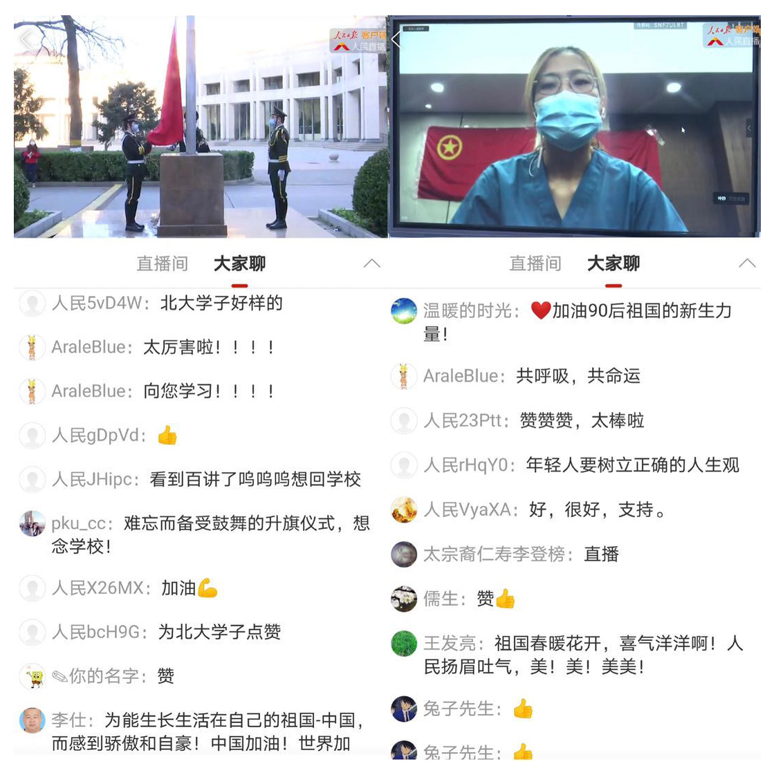 本次活動由人民日報客戶端進(jìn)行了現(xiàn)場直播,大家紛紛留言點贊。在這場“同升國旗,共學(xué)回信”主題升旗儀式中,北大援鄂醫(yī)療隊90后黨員、在北大首鋼醫(yī)院實習(xí)的西藏大學(xué)醫(yī)學(xué)院學(xué)生、在雪域高原從事基層工作的北大選調(diào)生、在西部支教扶貧的研究生支教團(tuán)志愿者的事跡深深感動著線上觀看升旗儀式的34萬余人(截至上午9點半),廣大青年學(xué)子不懼風(fēng)雨、勇挑重?fù)?dān)的堅定信念和愛國主義精神,與鮮紅的國旗一同飄揚在北大上空,飄揚在廣大青年的心中。