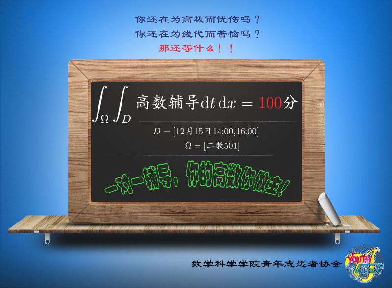 高數(shù)輔導的想法誕生于2011年9月,當時輔導小組被命名為“以數(shù)之名”。經(jīng)過兩個多月的前期準備,在數(shù)院青協(xié)骨干張楠、李立穎等人的組織下,第一次高數(shù)輔導于2011年11月27日成功舉行。