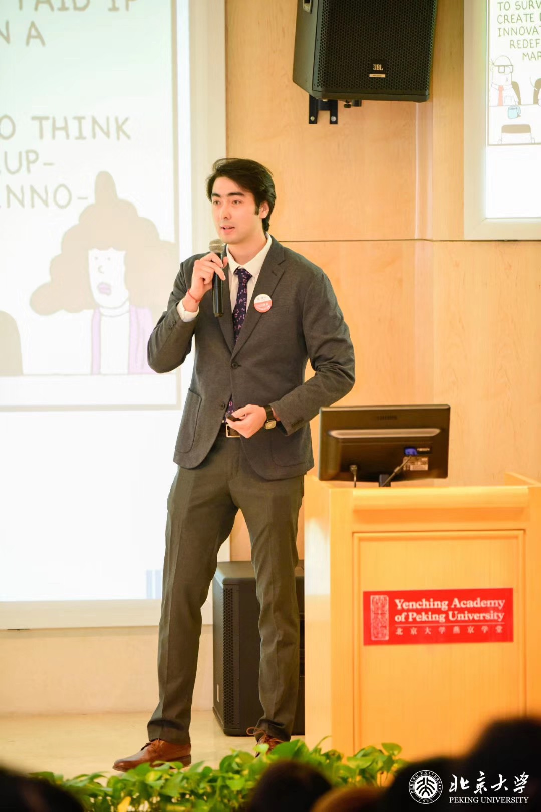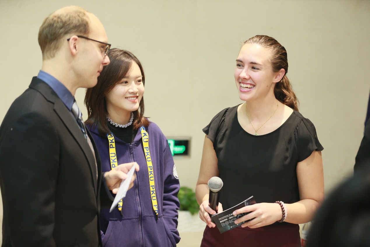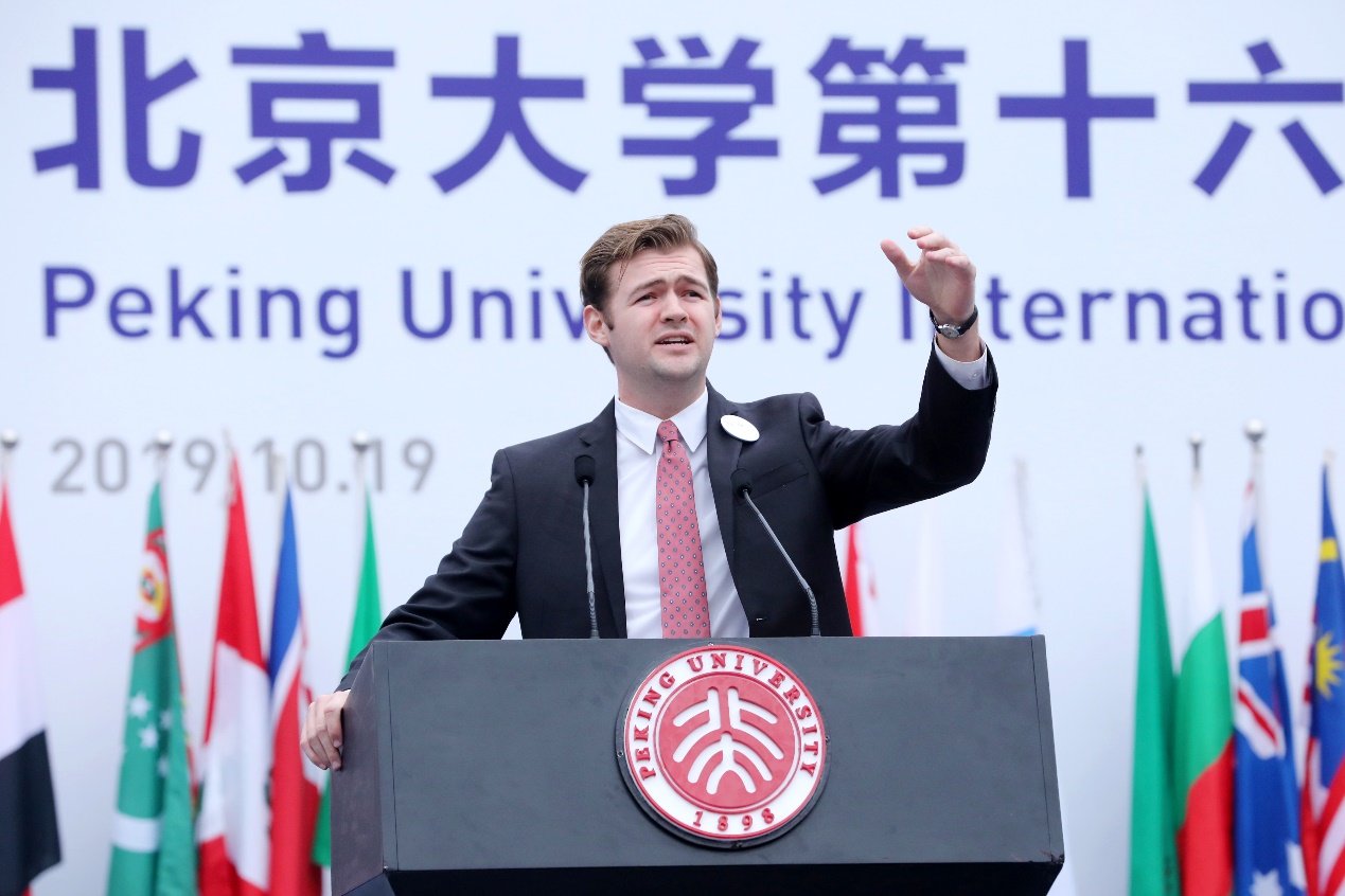 來自美國的木林森(CarsonMulligon)代表留學(xué)生發(fā)言。他從自己的中文名字說起,介紹了離開家鄉(xiāng)、來到北大學(xué)習(xí)、與中國結(jié)緣的經(jīng)歷,他表示,北大的課堂就像一個小聯(lián)合國,課堂上可以遇到來自許多國家的同學(xué),課堂就是很好的交流學(xué)習(xí)平臺。木林森與大家分享自己參加國際文化節(jié)的體會:在北京大學(xué),世界無界,來自四海的學(xué)子,在今天一起共襄盛會,不問來處,不問歸去。
