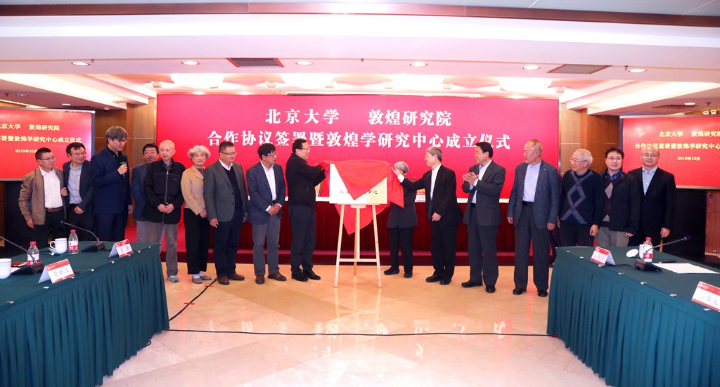 郝平、王博、張平文、樊錦詩、趙聲良、柴劍虹、郝春文、張先堂、北大外國語學(xué)院教授王邦維、段晴、榮新江、北大考古文博學(xué)院院長孫慶偉、北大藝術(shù)學(xué)院院長彭鋒、北大哲學(xué)系黨委書記束鴻俊、北大歷史學(xué)系系主任張帆、北大社會科學(xué)部部長龔六堂共同為敦煌學(xué)研究中心揭牌,標(biāo)志著敦煌學(xué)研究中心正式成立。