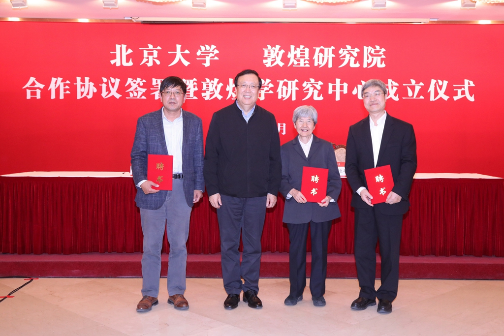郝平為樊錦詩、趙聲良、榮新江頒發(fā)聘書。成立儀式后,雙方合影留念。