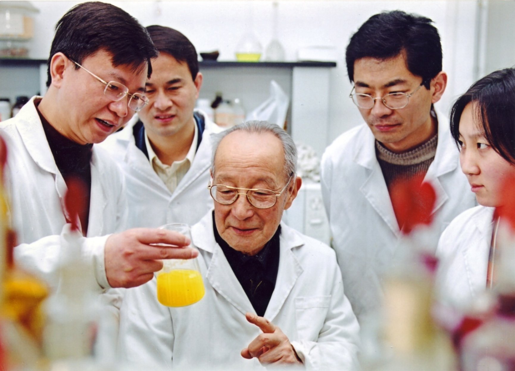 北京大學(xué)化學(xué)與分子工程學(xué)院教授徐光憲院士(中)在指導(dǎo)團(tuán)隊(duì)進(jìn)行實(shí)驗(yàn)